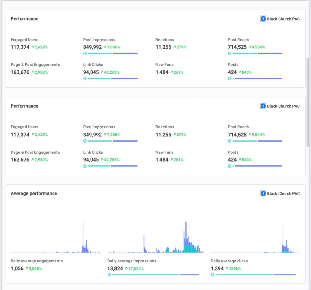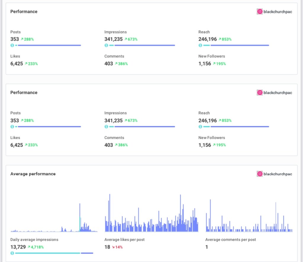- Improved impressions, average likes per post, and comments per post on all social media platforms